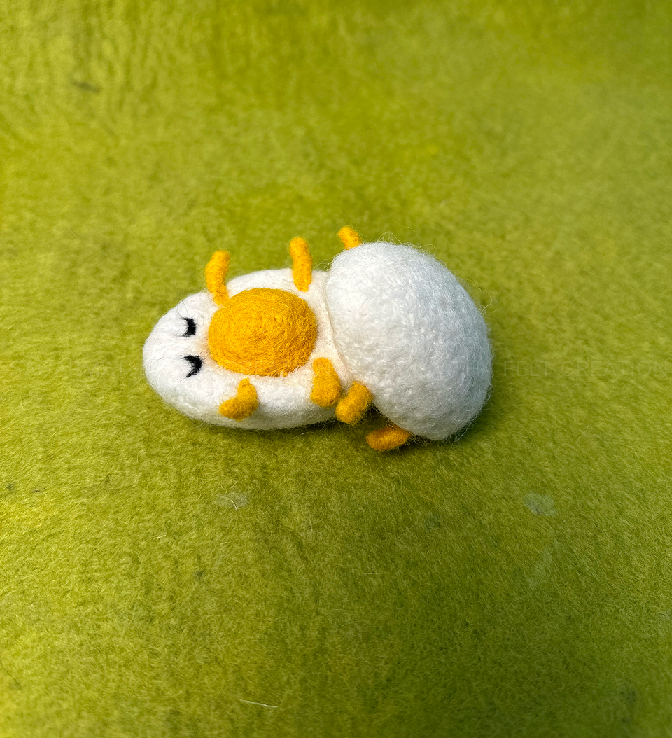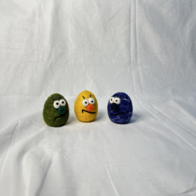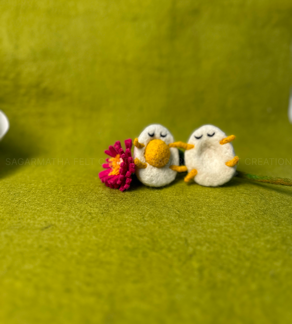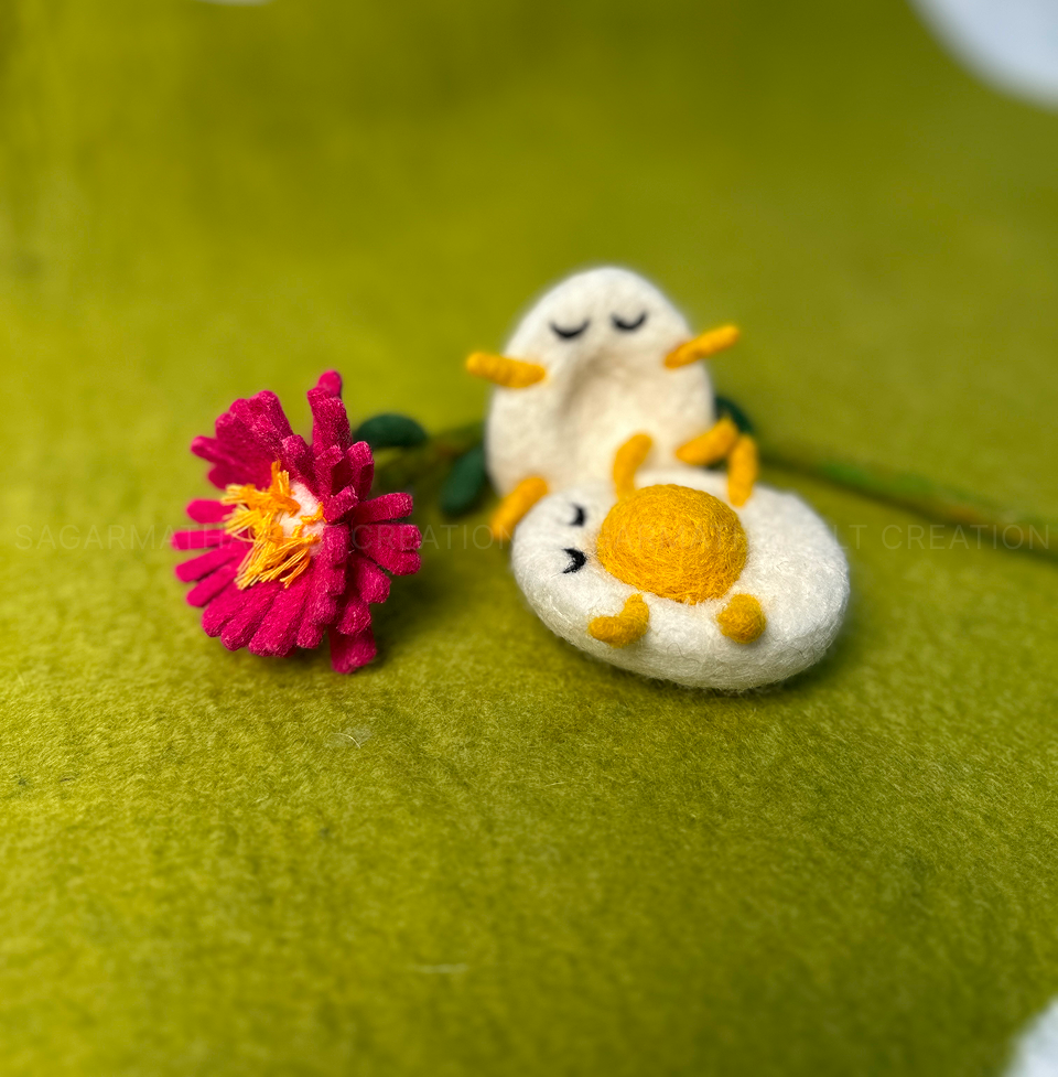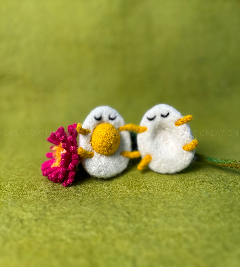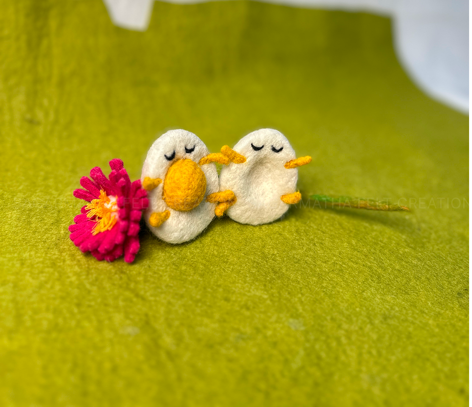 This Handmade Felt Easter Egg Couple is a lovely and fun decoration for Easter or any time of year. Made with soft wool, these two little eggs have closed eyes, tiny yellow feet, and a cute orange beak. They are sitting close together, holding a bright pink flower.